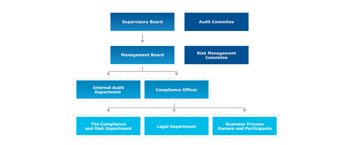 - monitoring, assessment and analysis of the risk of non-compliance of the company's operations with legal regulations, guidelines of supervisory authorities, internal regulations and standards,