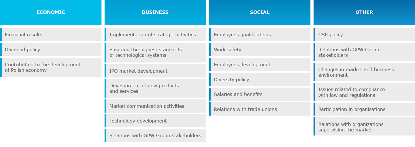 The core pillars of the GPW Group’s activity include the establishment and maintenance of successful lasting relations with many groups of internal and external stakeholders. In our daily business, we stress the key importance of stakeholders in value creation. We regularly engage our stakeholders to source diverse kinds of feedback. Stakeholders play a key role by communicating their perception of our performance, helping us to grow and tailor our products and services to current needs and market trends and better serve the investor community according to a future-proof business strategy. We know that stakeholder feedback can be useful in setting new trends which will rise in prominence.