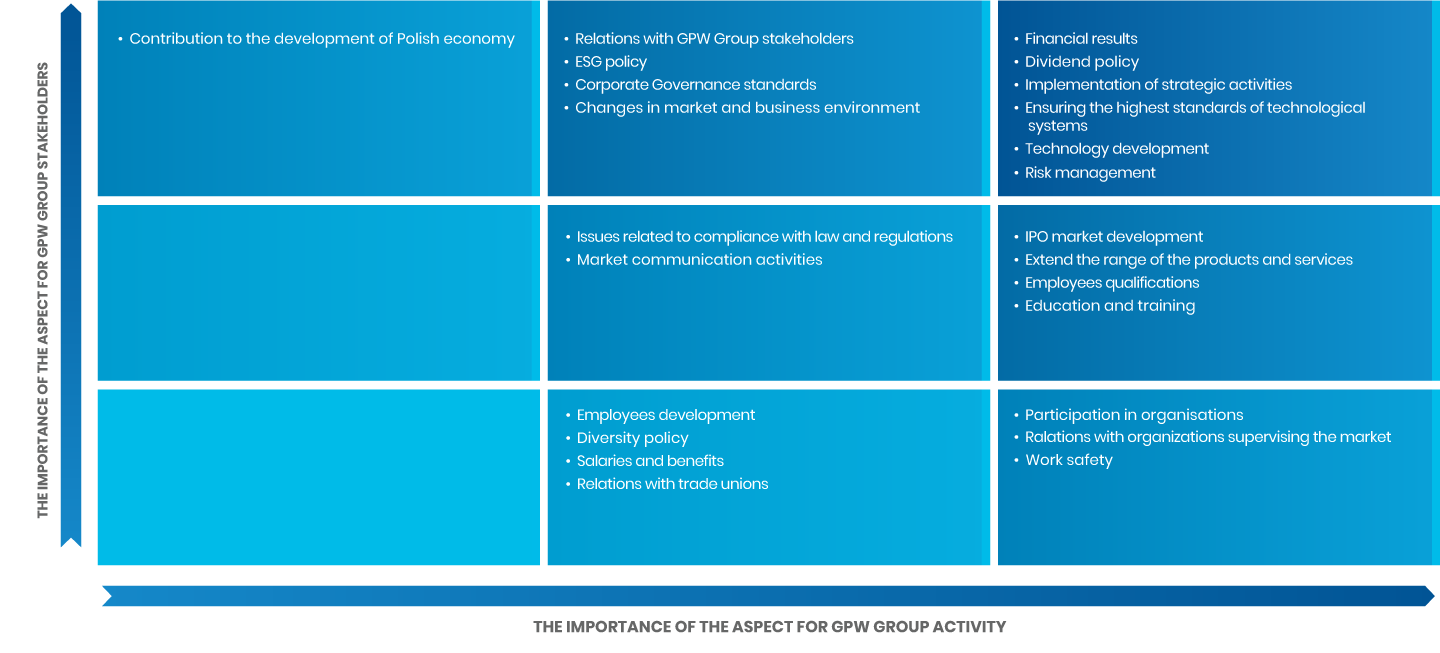 The materiality determination process, which involves: identifying relevant matters, evaluating the importance of relevant matters, prioritising the matters, and determining the information to disclose about material matters, took place as a structured internal consultation with selected employees and senior managers of the GPW Group taking into account our Perception Study. It produced a materiality matrix and a map of key factors of relevance to the stakeholders. Those include all financial and non-financial aspects affecting value creation in the GPW Group.