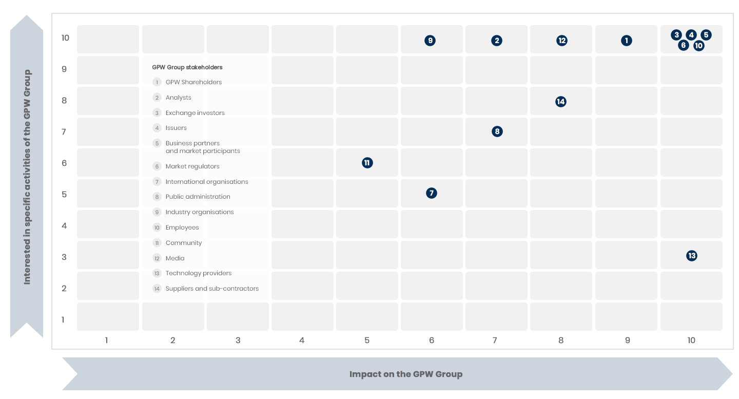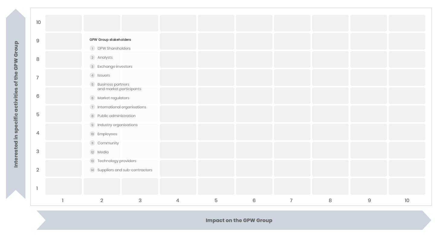 The above-mentioned activities allowed for the mapping of the GPW Group's stakeholders in 2020. This way, a stakeholder matrix was created, which shows which group is interested in the activities of the GPW Group and what influence it has on the GPW Group.