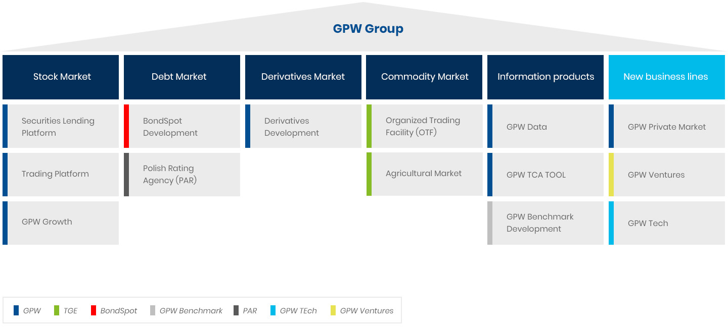 - GPW Ventures – an SPV to invest in venture capital funds (VC) as a passive investor. Financing instrument supporting growth of Polish venture capital and, in the longer term, IPOs in Poland;